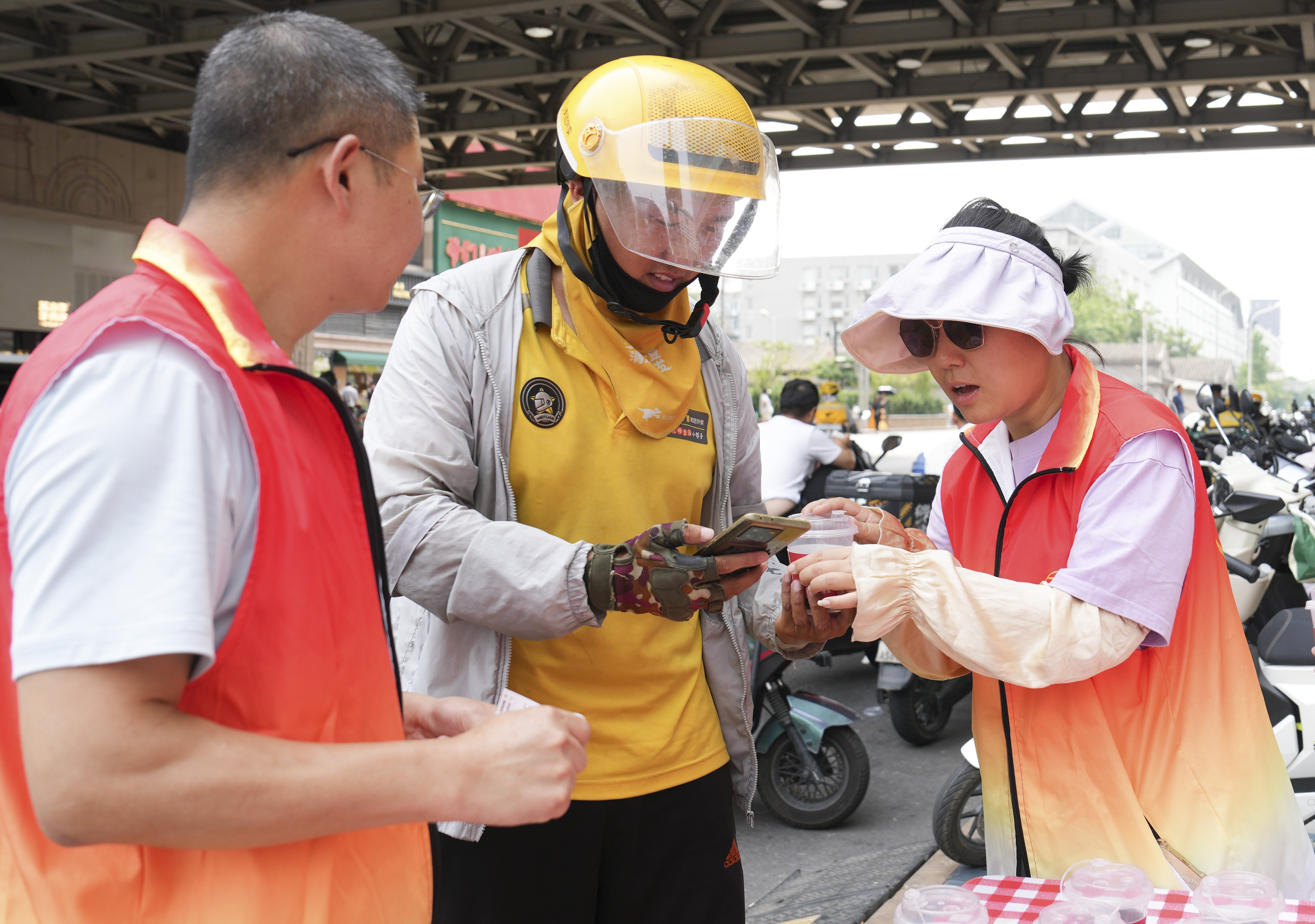 6月25日,在北京市东城区崇外街道一处“暖新驿站”外,街道工作人员在为高温下的外卖员、快递员准备冰镇饮料。新华社记者 鞠焕宗 摄