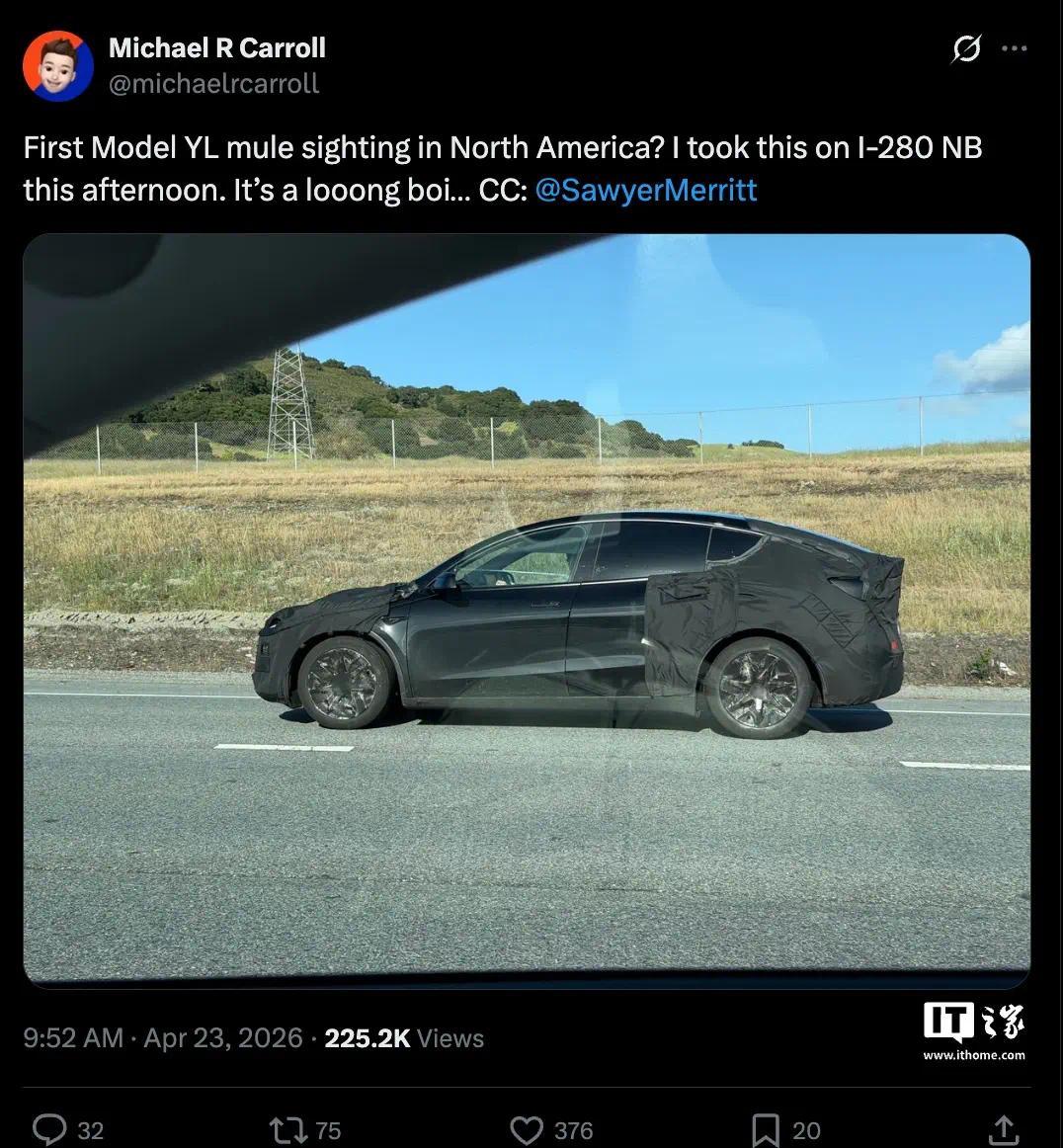 4 月 23 日消息,消息源 Michael R Carroll 发文,展示了一张位于美国旧金山湾区的特斯拉 Model Y L 原型车。作为比较,此前特斯拉 CEO 马斯克曾暗示 Model Y L 永远不会进入美国市场,如今看来马斯克似乎已开始“松口”。