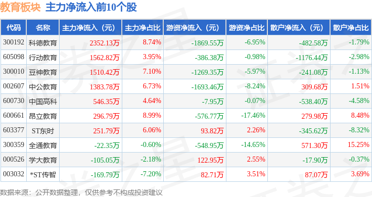 从资金流向上来看,当日教育板块主力资金净流入323.67万元,游资资金净流出4190.04万元,散户资金净流入3866.37万元。教育板块个股资金流向见下表: