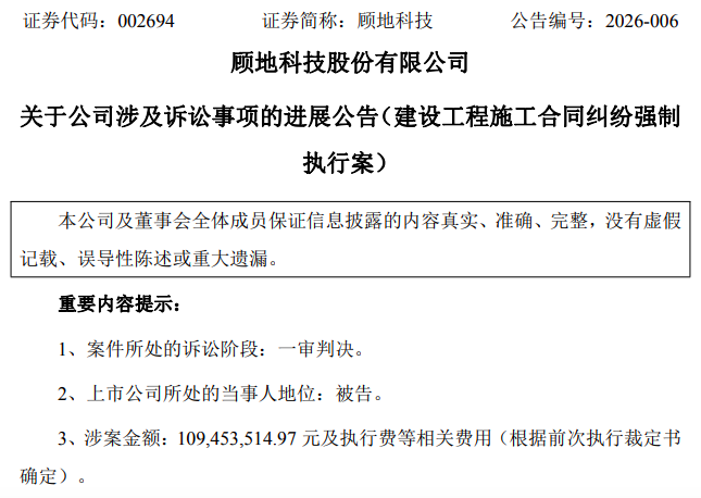 3月9日晚,顾地科技(002694)公告称,2026年3月6日,公司收到内蒙古自治区阿拉善盟中级人民法院下发的《民事判决书》,公司作为被告(执行案外人),被追加为(2021)内29执26号宁夏建工集团有限公司二分公司(下称“宁夏建工”)与阿拉善盟梦想汽车文化旅游开发有限公司(下称“梦想汽车”)建设工程施工合同纠纷一案的被执行人,对第三人梦想汽车在(2020)内29民初64号民事调解书中欠付宁夏建工的债务承担连带清偿责任,涉案金额为109,453,514.97元及执行费等相关费用。