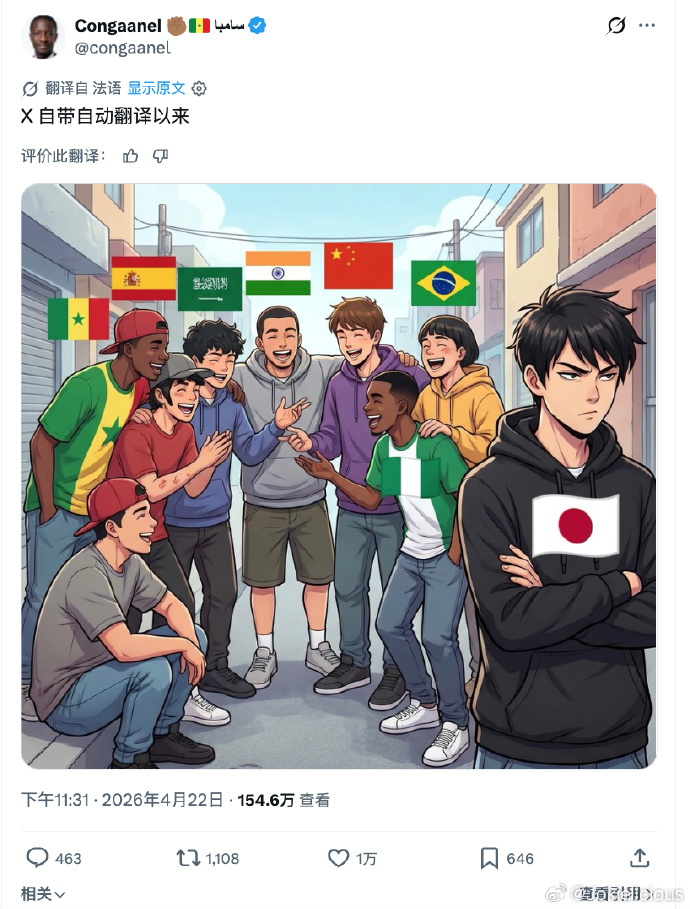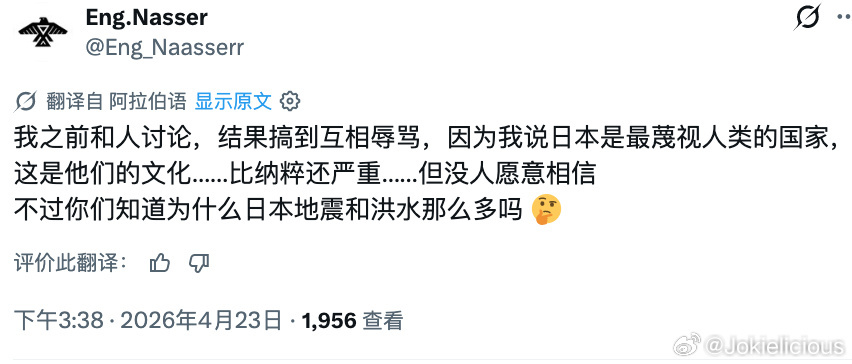 今年3月底的X算法更新,让日语圈层里的大量内容得以被自动翻译、自动推荐。这个功能就像一台巨型抽水机,把过去深藏在日本舆论场阴沟里的各种脏东西,全都给抽到了太阳底下。