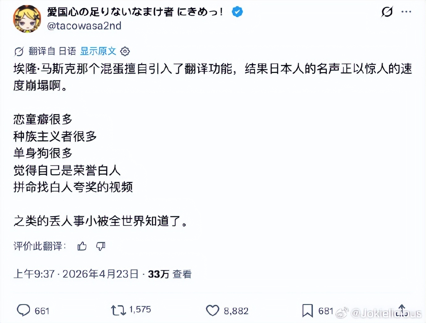 马斯克搞了个一键翻译,把日本右翼扒得底裤都不剩。